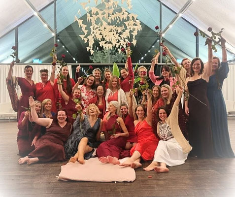Es war so tief nährend und wegweisend, mit Euch so ganz tief in meinen Schoßraum einzutauchen. Wie gern habe ich Euren Erzählungen gelauscht, wie sehr habe ich Eure Nähe, unser gemeinsames Tanzen, Malen und Weinen, Trommeln und Trauern und noch mehr ... genossen.